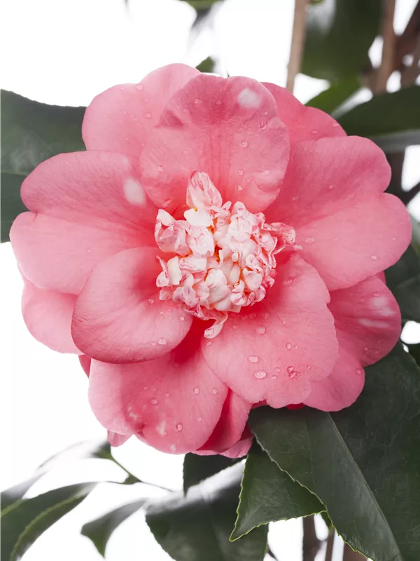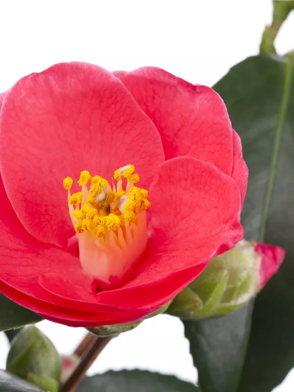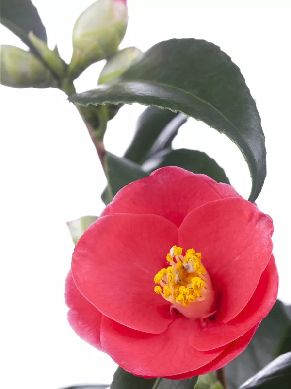 Camellia japonica bildet rote, rosafarbene, weiße Blüten ab Februar.