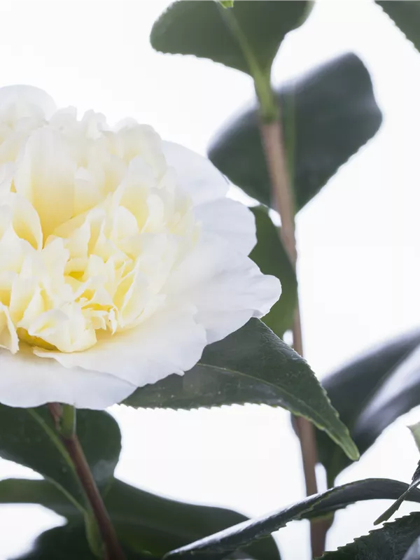 Die immergrünen Blätter der Japanische Kamelie sind dunkelgrün, lanzettlich, glänzend, ledrig, wechselständig. Diese sind etwa 5 - 8 cm groß.