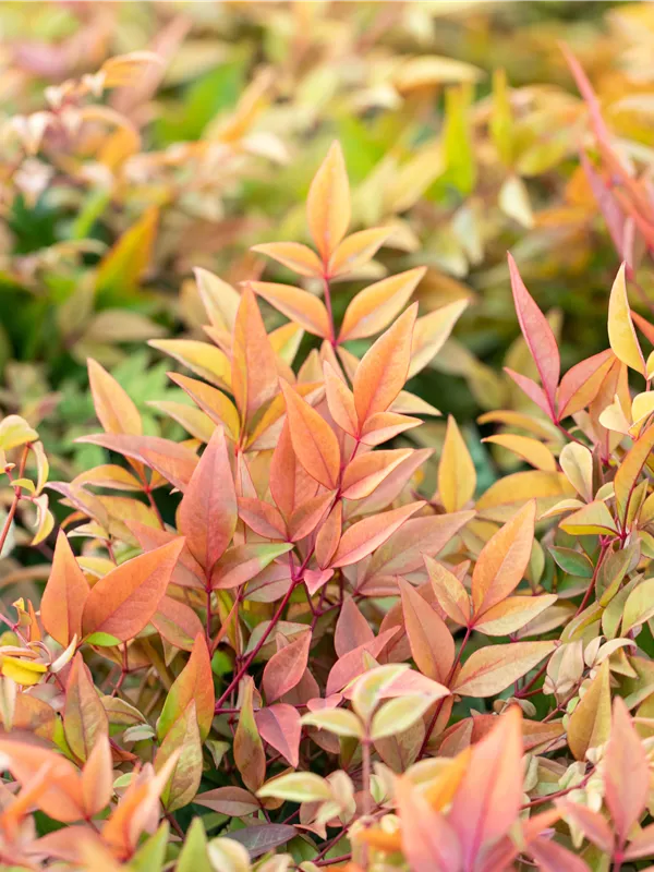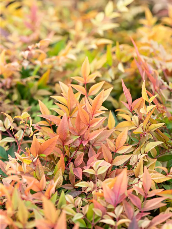 Die wintergrünen Blätter des Heiligen Bambuses 'Gulf Stream' sind gelb-rot, lanzettlich, ganzrandig. Heiliger Bambus 'Gulf Stream' zeigt sich leuchtend bronze im Herbst.
