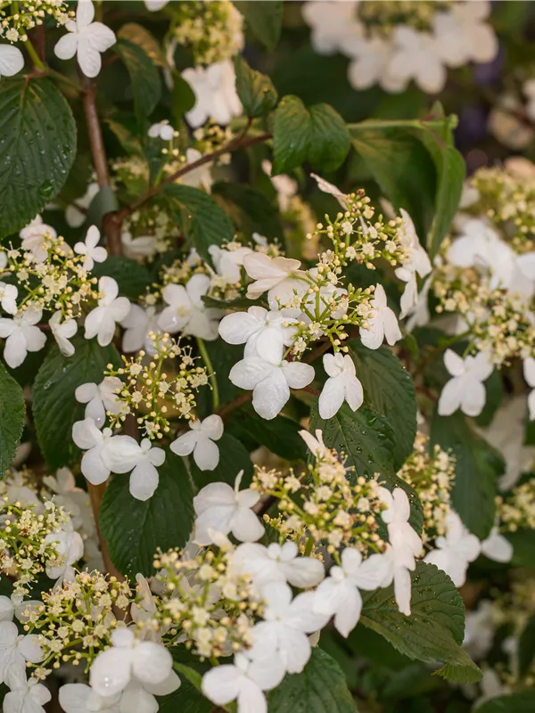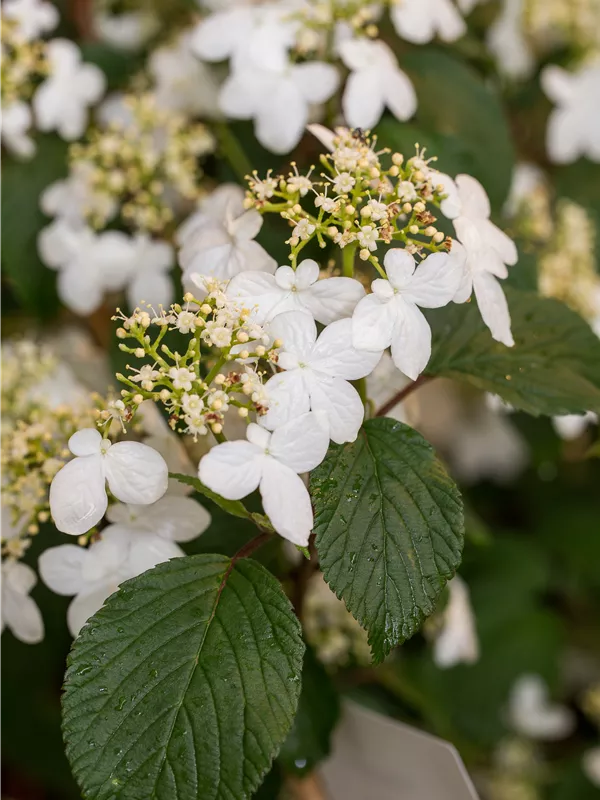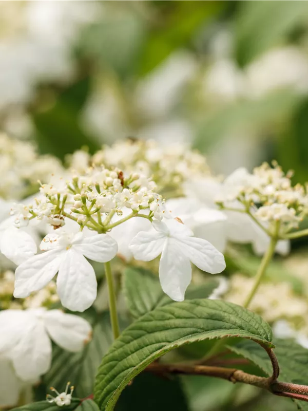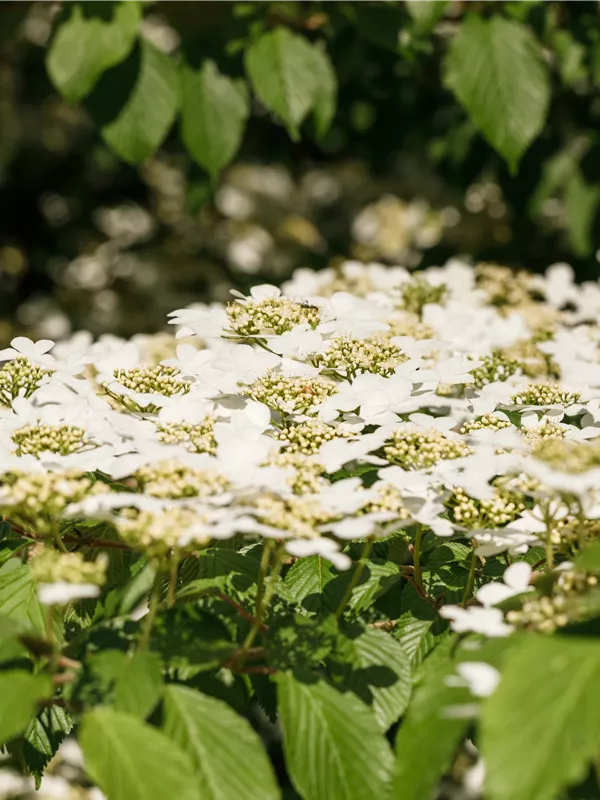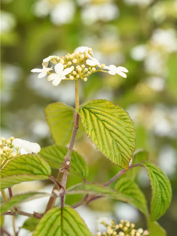 Die weißen, gefüllten Blüten des Japanischen Schneeball 'Kilimandjaro'® erscheinen in Trugdolden von Mai bis Juni. Diese sind stark duftend.