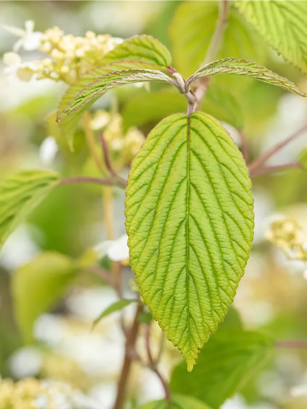 Die sommergrünen Blätter des Japanischen Schneeballs 'Kilimandjaro'® sind mittelgrün, eiförmig, gegenständig, gezähnt. Diese sind etwa 4 - 10 cm groß. Japanischer Schneeball 'Kilimandjaro'® zeigt sich leuchtend bordeauxrot bis rot-gelb im Herbst.